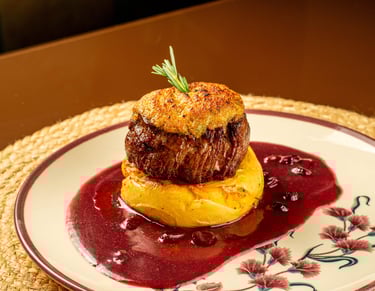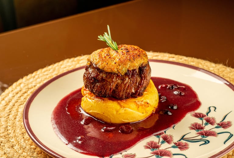 Filé Mignon in crosta de dijon e gorgonzola ao molho de vinho e cramberry, com batata assada em paprica defumada.