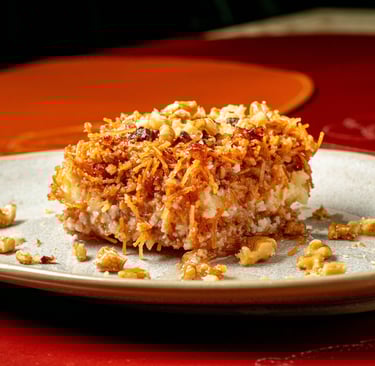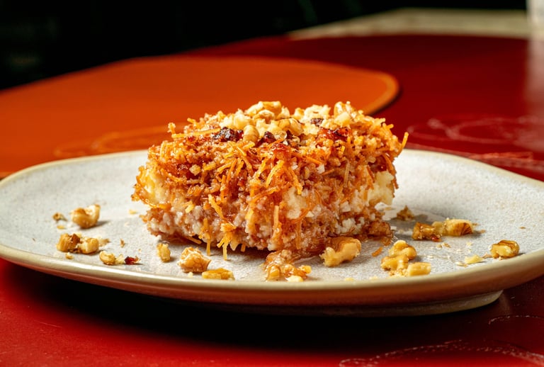 Knefe de ricota (com base de macarrão cabelinho de anjo, recheio de ricota com nozes e calda de água de rosas)
