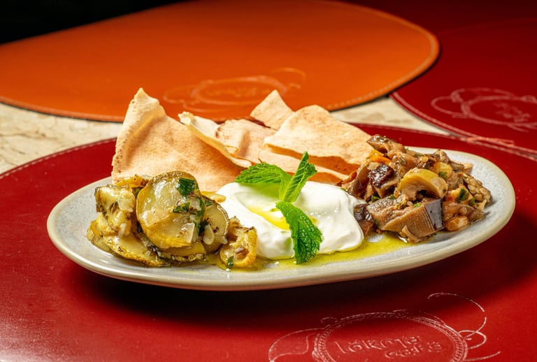 Trio de antepastos (coalhada, carpaccio de abobrinha e beringela)