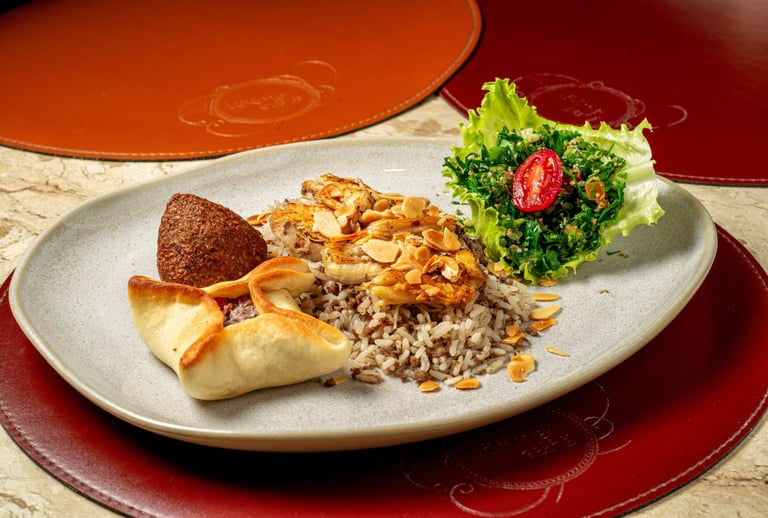 Arroz marroquino (carne moída, frango e amêndoas tostadas), salada tabule, kibe e esfiha