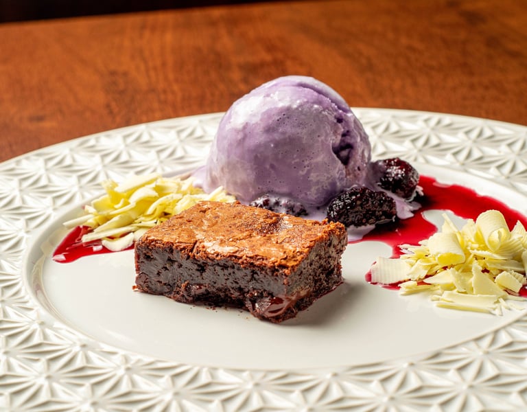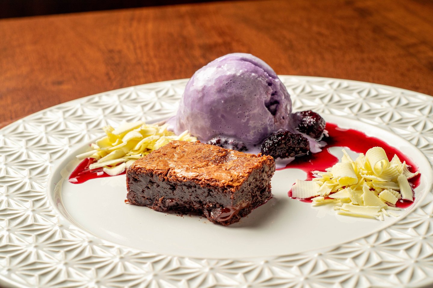 Brownie com sorvete de blueberry e geleia de frutas vermelhas