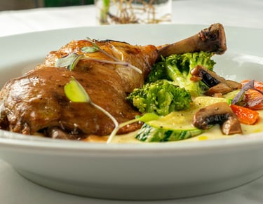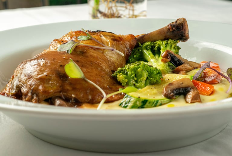Confit de frango com aligot de batata, molho de vinho e legumes salteados