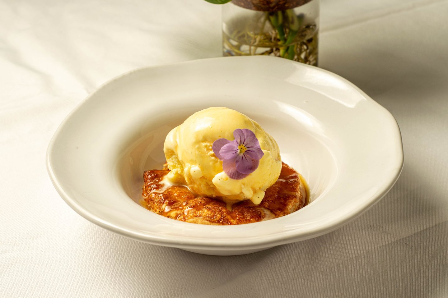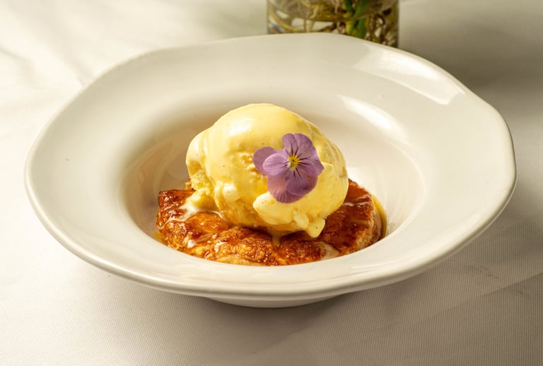 Folheado de maçã verde com caramelo toffee e sorvete de creme.