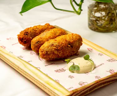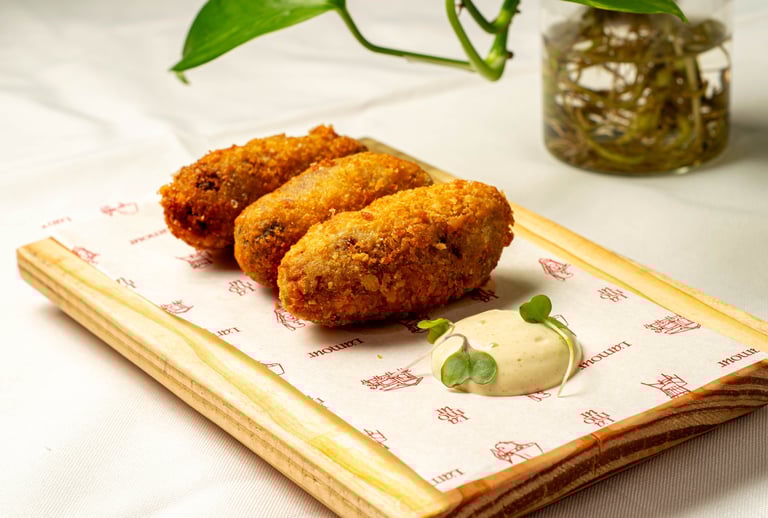 Croquette de Bœuf Bourguignon com aioli de mostarda Dijon.