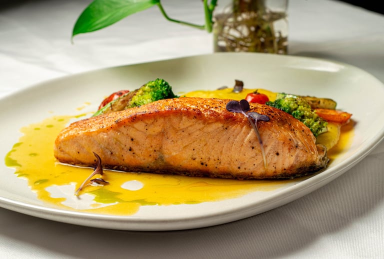 Salmão grelhado com mousseline de mandioquinha, legumes salteados e buerre blanc de maracujá.
