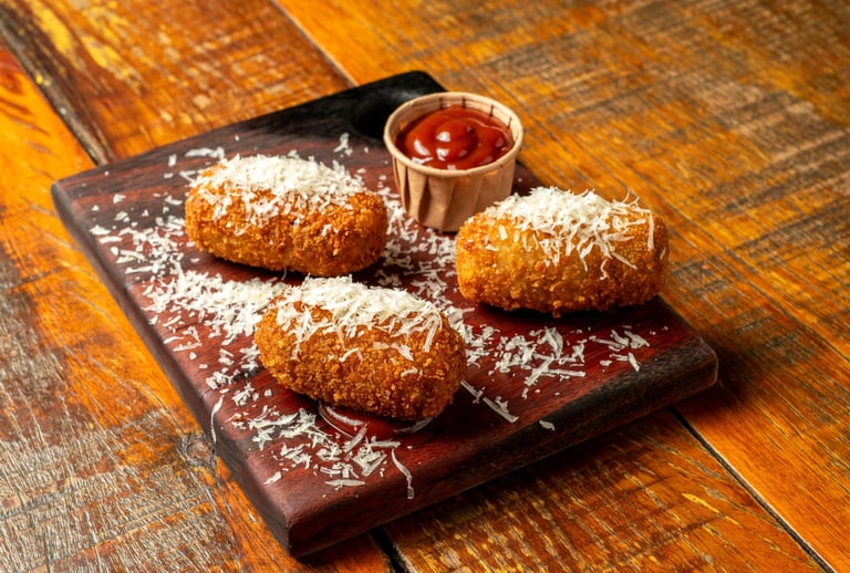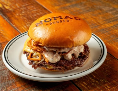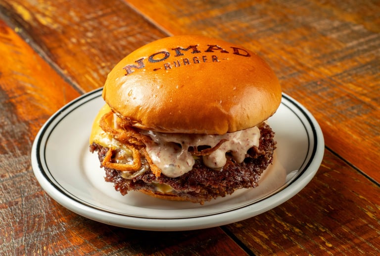 Crispim: 2 smashs de 70g, american cheese, cebola empanada e maionese de bacon