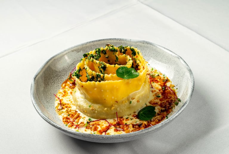 Pappardelle ripiene recheado com ossobuco e cebola caramelizada, molho de fonduta de parmesão com nozes, finalizado com gremolata de avelã